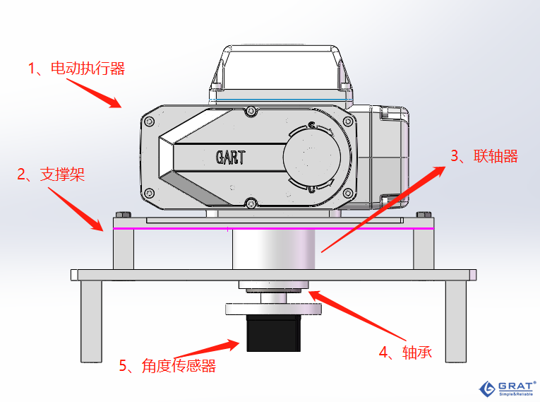 用戶通過(guò)放置電動(dòng)執(zhí)行器,給電動(dòng)執(zhí)行器通電進(jìn)行運(yùn)轉(zhuǎn),電動(dòng)執(zhí)行器通過(guò)聯(lián)軸器與下方的角度傳感器同步旋轉(zhuǎn),從而反饋給用戶當(dāng)前角度位置,減少調(diào)試過(guò)程中的誤差,提高用戶的調(diào)試效率。批量調(diào)試時(shí),效果顯著。