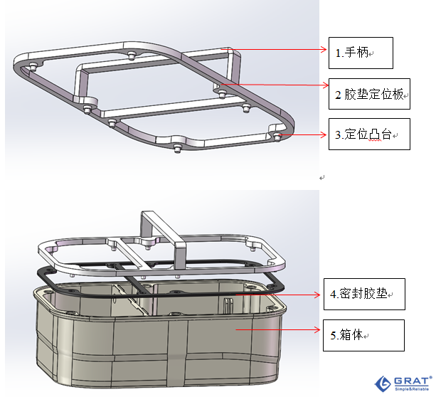 將密封膠墊4不含膠端放置于定位凸臺(tái)3上,定位凸臺(tái)3的大圓端凸臺(tái)與密封膠墊4的孔配合,揭開密封膠墊4含膠端的保護(hù)膜,將定位凸臺(tái)3的小圓端與箱體5的孔位連接,按壓平整后,用手柄1提起膠墊定位板2,完