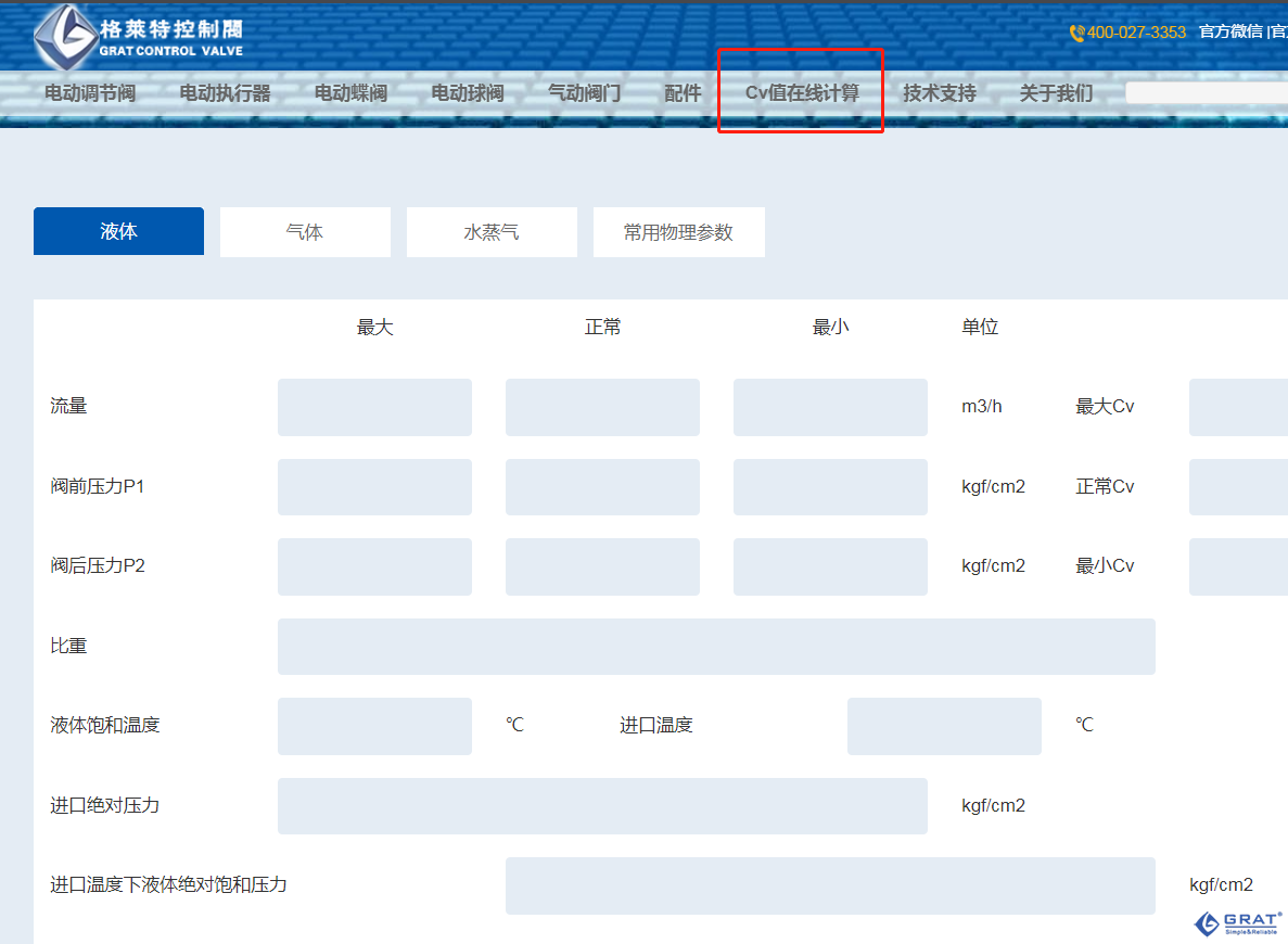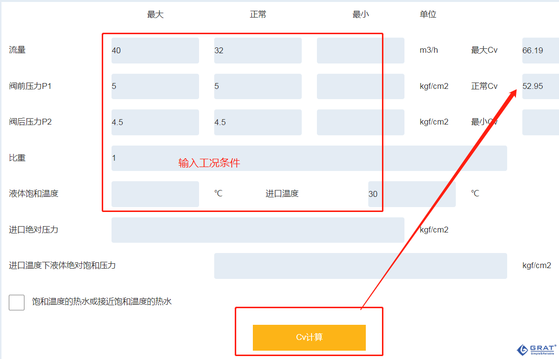 為方便計算,可轉(zhuǎn)至我司官網(wǎng)(地址:http://m.tame90276.cn/Cv/)輸入工況數(shù)據(jù),即可計算出Cv值