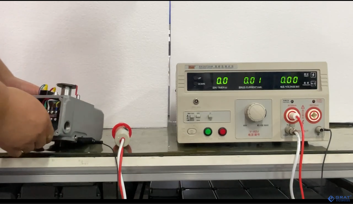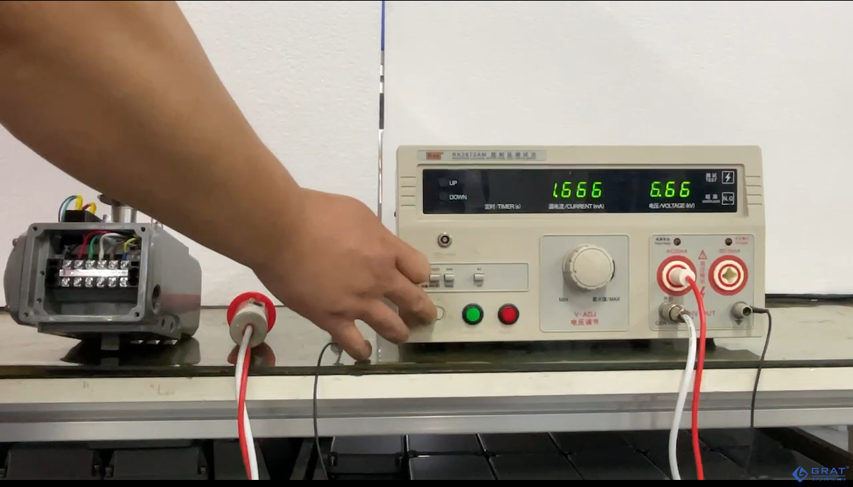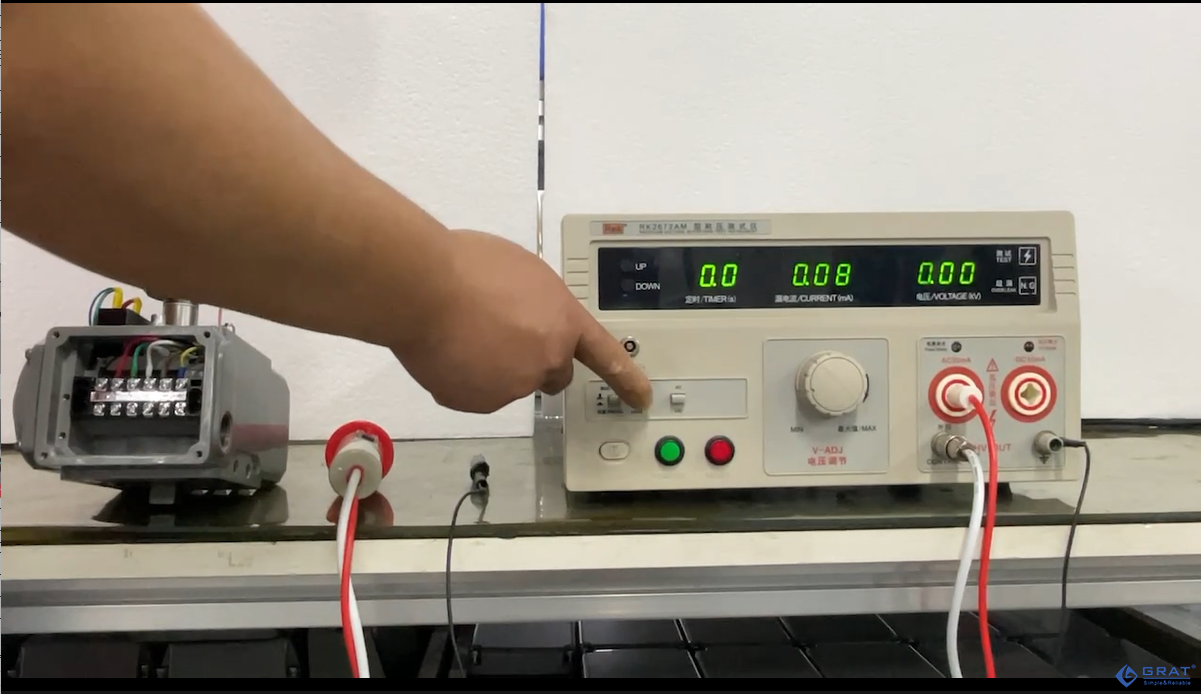 第三步、將待測(cè)執(zhí)行器箱體頂絲連接耐壓測(cè)試儀的接地線