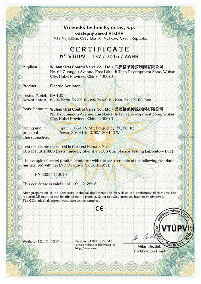 格萊特控制閥于2015年12月16日獲得歐盟安全合格CE認(rèn)證證書。 EMC證書號(hào):LCS1511201789E LVD證書號(hào):LCS1511201788S 歐盟機(jī)械認(rèn)證,測(cè)試產(chǎn)品通過LVD、EMC機(jī)械指令。最大程度地獲取消費(fèi)者和市場(chǎng)監(jiān)督機(jī)構(gòu)的信任。