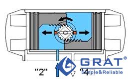 反之氣源壓力從氣口(4)進(jìn)入氣缸兩端氣腔時,使兩活塞向氣缸中間方向移動,中間氣腔的空氣通過氣口(2)排出,同時使兩活塞齒條同步帶動輸出軸(齒輪)順時針方向旋轉(zhuǎn)。(如果把活塞相對反方向安裝,輸出軸變?yōu)榉聪蛐D(zhuǎn),即為雙作用反轉(zhuǎn)DL型)