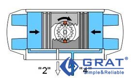 當(dāng)氣源壓力從氣口(2)進(jìn)入氣缸兩活塞之間中腔時,使兩活塞分離向氣缸兩端方向移動,兩端氣腔的空氣通過氣口(4)排出,同時使兩活塞齒條同步帶動輸出軸(齒輪)逆時針方向旋轉(zhuǎn)。