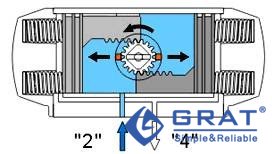 在氣源壓力經(jīng)過(guò)電磁閥換向后,氣缸的兩活塞在彈簧的彈力下向中間方向移動(dòng),中間氣腔的空氣從氣口(2)排出,同時(shí)使兩活塞齒條同步帶動(dòng)輸出軸(齒輪)順時(shí)針?lè)较蛐D(zhuǎn)。(如果把活塞相對(duì)反方向安裝,彈簧復(fù)位時(shí)輸出軸變?yōu)榉聪蛐D(zhuǎn),即為單作用反轉(zhuǎn))