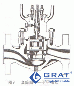 通常所說的“頂進”式閥門或套筒閥,具有閥內(nèi)件容易拆卸的優(yōu)點。圖9表示一個典型的不平衡式單座閥內(nèi)件套筒閥。這種類型的閥門常常有流線型的閥體通道,以增加流通能力。閥內(nèi)零件常常稱為“可快速更換的閥內(nèi)件”在拆去上閥蓋之后就可以取出內(nèi)件,因為內(nèi)部沒有螺紋。各種套筒閥的結(jié)構(gòu)特點是:把含有石棉或聚四氟乙烯填料的撓性金屬墊片放在閥座環(huán)和閥體之間。這種墊片也被套筒壓住并做為上閥蓋和閥座環(huán)之間的襯墊。