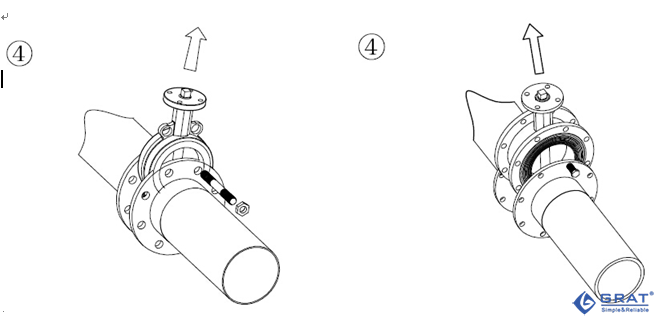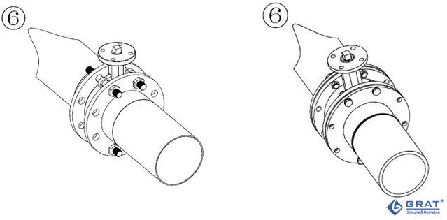 2.2.2 按圖示將兩端螺栓螺母分別輕輕插入兩端對(duì)應(yīng)的法蘭孔(法蘭式蝶閥需調(diào)整墊片位置),將螺母稍加擰緊以校正法蘭面的平面度;