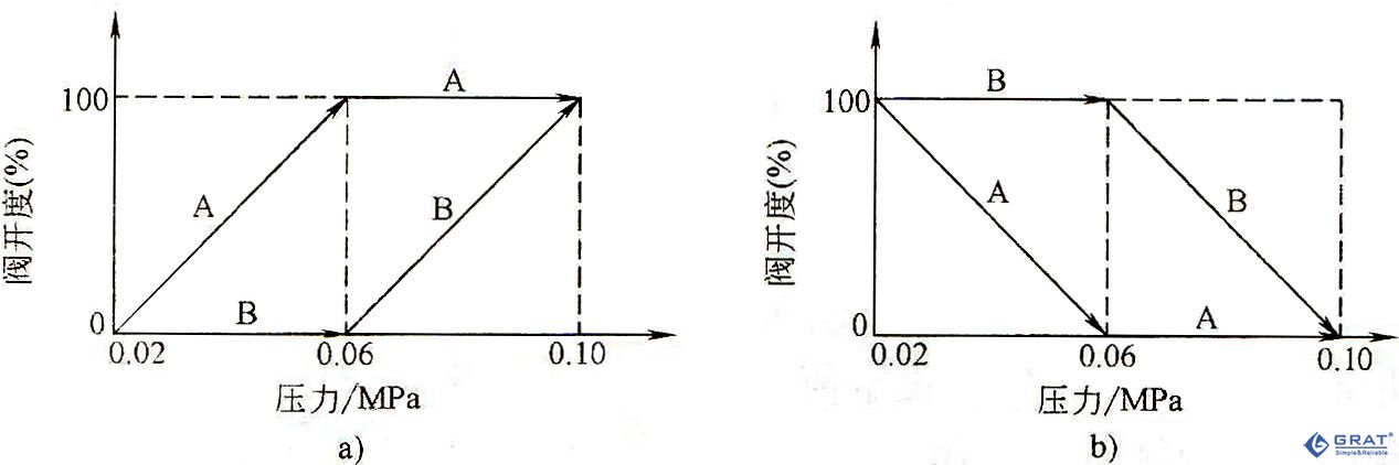 圖7-16所示為調(diào)節(jié)閥同向動(dòng)作示意圖,圖a表示兩個(gè)調(diào)節(jié)閥都為氣開(kāi)式,圖b表示兩個(gè)都 為氣關(guān)式。由圖7-16a可知,當(dāng)調(diào)節(jié)閥輸出信號(hào)從0.02MPa增大時(shí),閥A開(kāi)始打開(kāi);閥B處于全關(guān)狀態(tài);當(dāng)信號(hào)增大到0.06MPa時(shí),閥A全開(kāi),閥B開(kāi)始打開(kāi);當(dāng)信號(hào)增大到0.1MPa時(shí),閥B全開(kāi)。由圖7-16b可知,當(dāng)調(diào)節(jié)器輸出信號(hào)從0.02MPa增大時(shí),閥A由全開(kāi)狀態(tài)開(kāi)始關(guān)閉,閥B則處于全開(kāi)狀態(tài);當(dāng)信號(hào)達(dá)到0.06MPa時(shí),閥A全關(guān),而閥B則由全開(kāi)狀態(tài)開(kāi)始關(guān)閉;當(dāng)信號(hào)達(dá)到0.1MPa時(shí),閥B也全關(guān)。