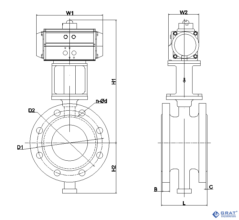 | 通徑 (DN) | L | D1 | D2 | n-Φd | B | C | H2 | 雙作用 | 單作用 | ||||