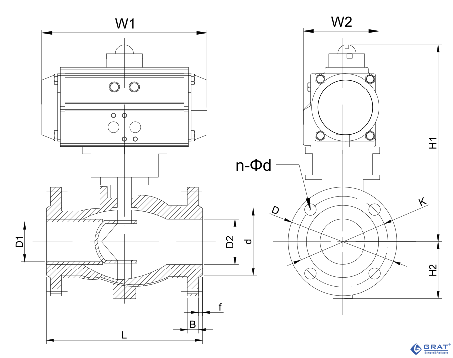 | 通徑DN(mm) | 直徑 英寸 | D1 | D2 | d | K | D | n-Φd | B | F | L | H2 | 雙作用 | 單作用 | ||||