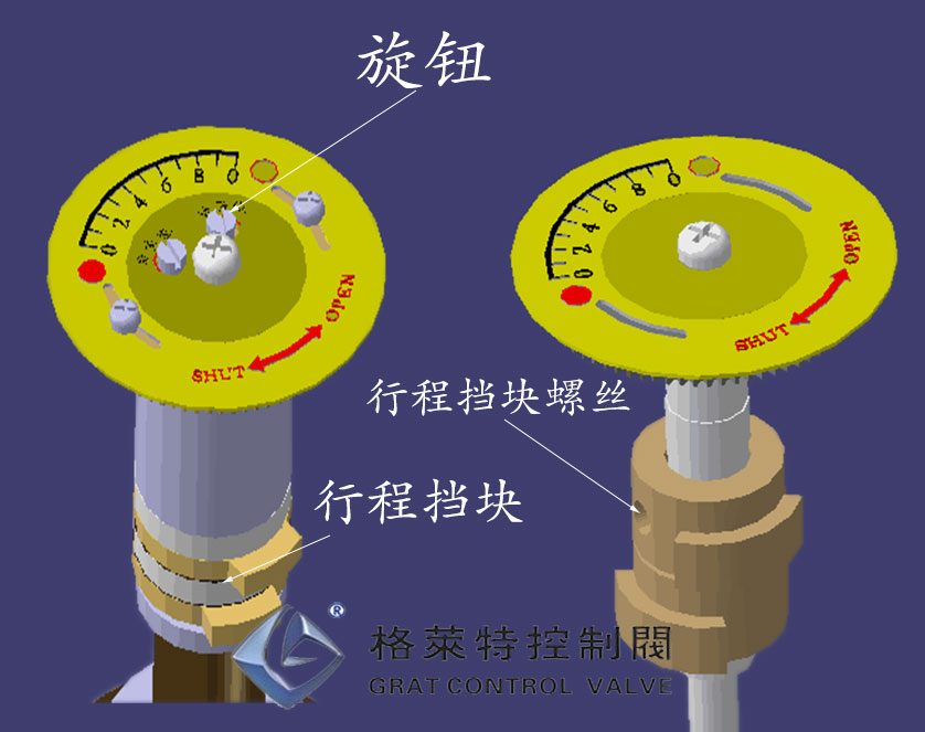 旋轉(zhuǎn)刻度盤頂部旋鈕即可輕松完成電動執(zhí)行機(jī)構(gòu)與閥門連接后的電氣、機(jī)械位置校準(zhǔn)調(diào)試! 旋轉(zhuǎn)刻度盤頂部旋鈕即可輕松完成電動執(zhí)行機(jī)構(gòu)與閥門連接后的電氣、機(jī)械位置校準(zhǔn)調(diào)試!